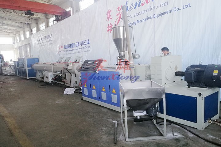●PVC管材生產線采用大長徑錐形雙螺桿擠出機,合理的螺桿設計,保證高產同時材料剪切塑化質量好,且耗能低。